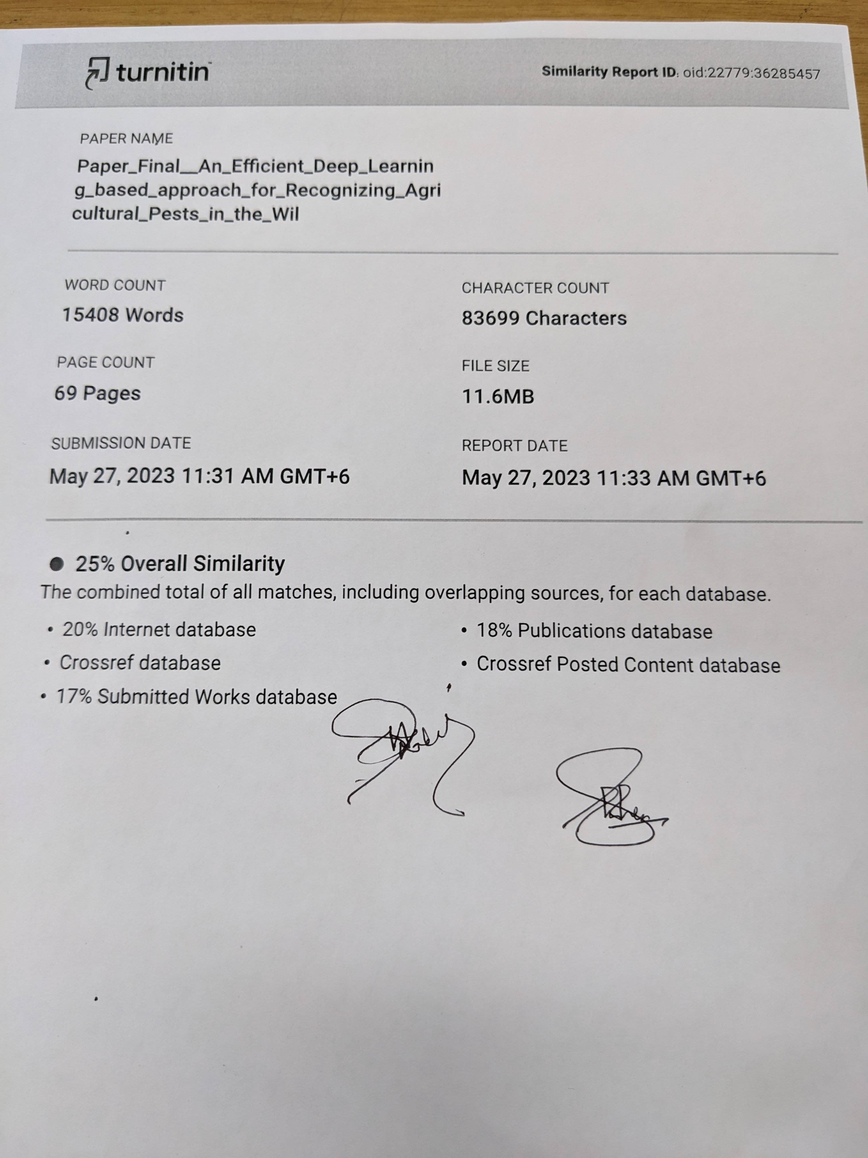 [1] X. Wu, C. Zhan, Y.-K. Lai, M.-M. Cheng, and J. Yang, “Ip102: A large-scale benchmark dataset for insect pest recognition,” in Proceedings of the IEEE/CVF conference on computer vision and pattern recognition, 2019, pp. 8787–8796. [2] M. Tan and Q. Le, “Efficientnetv2: Smaller models and faster training,” in Inter national Conference on Machine Learning. PMLR, 2021, pp. 10 096–10 106. [3] Y. Peng and Y. Wang, “Cnn and transformer framework for insect pest classifica tion,” Ecological Informatics, vol. 72, p. 101846, 2022. [4] H. T. Ung, H. Q. Ung, and B. T. Nguyen, “An efficient insect pest classifica tion using multiple convolutional neural network based models,” arXiv preprint arXiv:2107.12189, 2021. [5] F. Wang, M. Jiang, C. Qian, S. Yang, C. Li, H. Zhang, X. Wang, and X. Tang, “Residual attention network for image classification,” in Proceedings of the IEEE conference on computer vision and pattern recognition, 2017, pp. 3156–3164. [6] S. Woo, J. Park, J.-Y. Lee, and I. S. Kweon, “Cbam: Convolutional block at tention module,” in Proceedings of the European conference on computer vision (ECCV), 2018, pp. 3–19. [7] J. Redmon, S. Divvala, R. Girshick, and A. Farhadi, “You only look once: Uni fied, real-time object detection,” in Proceedings of the IEEE conference on com puter vision and pattern recognition, 2016, pp. 779–788. [8] M. T. Mason, Mechanics of robotic manipulation. MIT press, 2001. [9] M. Caron, H. Touvron, I. Misra, H. Jégou, J. Mairal, P. Bojanowski, and A. Joulin, “Emerging properties in self-supervised vision transformers,” in Pro ceedings of the IEEE/CVF international conference on computer vision, 2021, pp. 9650–9660. [10] G. Huang, Z. Liu, L. Van Der Maaten, and K. Q. Weinberger, “Densely connected convolutional networks,” in Proceedings of the IEEE conference on computer vision and pattern recognition, 2017, pp. 4700–4708. 54 [11] G. Kandalkar, A. Deorankar, and P. Chatur, “Classification of agricultural pests using dwt and back propagation neural networks,” International Journal of Com puter Science and Information Technologies, vol. 5, no. 3, pp. 4034–4037, 2014. [12] D. Xia, P. Chen, B. Wang, J. Zhang, and C. Xie, “Insect detection and classi fication based on an improved convolutional neural network,” Sensors, vol. 18, no. 12, p. 4169, 2018. [13] A. K. Reyes, J. C. Caicedo, and J. E. Camargo, “Fine-tuning deep convolutional networks for plant recognition.” CLEF (Working Notes), vol. 1391, pp. 467–475, 2015. [14] K. He, X. Zhang, S. Ren, and J. Sun, “Deep residual learning for image recog nition,” in Proceedings of the IEEE conference on computer vision and pattern recognition, 2016, pp. 770–778. [15] M. Dyrmann, H. Karstoft, and H. S. Midtiby, “Plant species classification using deep convolutional neural network,” Biosystems engineering, vol. 151, pp. 72– 80, 2016. [16] H. Zhang, G. He, J. Peng, Z. Kuang, and J. Fan, “Deep learning of path-based tree classifiers for large-scale plant species identification,” in 2018 IEEE Conference on Multimedia Information Processing and Retrieval (MIPR). IEEE, 2018, pp. 25–30. [17] S. Ji, C. Zhang, A. Xu, Y. Shi, and Y. Duan, “3d convolutional neural networks for crop classification with multi-temporal remote sensing images,” Remote Sensing, vol. 10, no. 1, p. 75, 2018. [18] C.-W. Lin, Q. Ding, W.-H. Tu, J.-H. Huang, and J.-F. Liu, “Fourier dense network to conduct plant classification using uav-based optical images,” IEEE Access, vol. 7, pp. 17 736–17 749, 2019. [19] S. W. Chen, S. S. Shivakumar, S. Dcunha, J. Das, E. Okon, C. Qu, C. J. Taylor, and V. Kumar, “Counting apples and oranges with deep learning: A data-driven approach,” IEEE Robotics and Automation Letters, vol. 2, no. 2, pp. 781–788, 2017. [20] S. P. Mohanty, D. P. Hughes, and M. Salathé, “Using deep learning for image based plant disease detection,” Frontiers in plant science, vol. 7, p. 1419, 2016. [21] A. Kamilaris and F. X. Prenafeta-Boldú, “Deep learning in agriculture: A survey,” Computers and electronics in agriculture, vol. 147, pp. 70–90, 2018. [22] M. H. Saleem, J. Potgieter, and K. M. Arif, “Plant disease detection and classifi cation by deep learning,” Plants, vol. 8, no. 11, p. 468, 2019. 55 [23] K. G. Liakos, P. Busato, D. Moshou, S. Pearson, and D. Bochtis, “Machine learn ing in agriculture: A review,” Sensors, vol. 18, no. 8, p. 2674, 2018. [24] J. G. Barbedo, “Factors influencing the use of deep learning for plant disease recognition,” Biosystems engineering, vol. 172, pp. 84–91, 2018. [25] R. Wang, J. Zhang, W. Dong, J. Yu, C. Xie, R. Li, T. Chen, and H. Chen, “A crop pests image classification algorithm based on deep convolutional neural network,” TELKOMNIKA (Telecommunication Computing Electronics and Con trol), vol. 15, no. 3, pp. 1239–1246, 2017. [26] F. Ren, W. Liu, and G. Wu, “Feature reuse residual networks for insect pest recog nition,” IEEE access, vol. 7, pp. 122 758–122 768, 2019. [27] Z. Liu, J. Gao, G. Yang, H. Zhang, and Y. He, “Localization and classification of paddy field pests using a saliency map and deep convolutional neural network,” Scientific reports, vol. 6, no. 1, pp. 1–12, 2016. [28] L. Nanni, G. Maguolo, and F. Pancino, “Insect pest image detection and recogni tion based on bio-inspired methods,” Ecological Informatics, vol. 57, p. 101089, 2020. [29] E. Ayan, H. Erbay, and F. Varçın, “Crop pest classification with a genetic algorithm-based weighted ensemble of deep convolutional neural networks,” Computers and Electronics in Agriculture, vol. 179, p. 105809, 2020. [30] Y. LeCun, L. Bottou, Y. Bengio, and P. Haffner, “Gradient-based learning applied to document recognition,” Proceedings of the IEEE, vol. 86, no. 11, pp. 2278– 2324, 1998. [31] L. Alzubaidi, J. Zhang, A. J. Humaidi, A. Al-Dujaili, Y. Duan, O. Al-Shamma, J. Santamaría, M. A. Fadhel, M. Al-Amidie,